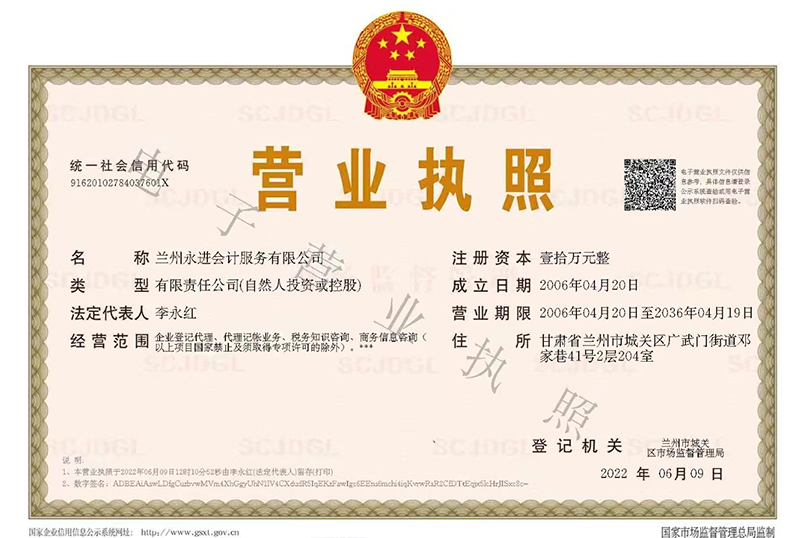 蘭州永進會計服務有限公司(Lanzhou Yongjin Accounting Service Co., Ltd.)成立于2006年04月20日,注冊地位于蘭州市城關區廣武門街道鄧家巷41號2層204室,法定代表人為李永紅。經營范圍包括企業登記代理、代理記帳業務、稅務知識咨詢、商務信息咨詢等。至今已為多家企業提供了包括公司注冊、驗資、增資、審計、評估、網上年檢、資質認證、一般納稅人認定、代理做賬、納稅申報在內的系統服務。企業登記注冊(營業執照、組織機構代碼證、國地稅登記證辦理),以及企業成立開業后變更、轉讓、納稅申報、財務做賬代理、商標注冊代理、企業年度審計、年檢、注銷、歇業、辦理分支機構等后續一站式服務。